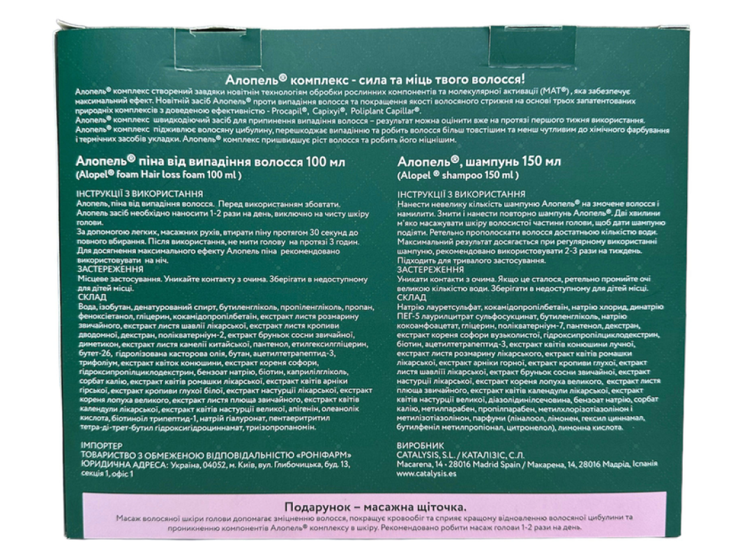 Алопель піна: Aqua, Isobutane, Alcohol Denat, бутиленгліколь, пропіленгліколь, пропан, феноксіетанол, гліцерин, кокамідопропіл бетаїн, екстракт листя Rosmarinus Officinalis, екстракт листя Salvia Officinalis, екстракт листя Urtica Dioica, декстран, полікватерній-11, екстракт бутонів Pinus Sylvestris Bud Extract, PEG/PPG-20/6 Dimethicone, екстракт листя Camellia Sinensis, пантенол, етилгексилгліцерин, PPG-26-Buteth-26, камфора, PEG-40 гідрогенізована касторова олія, бутан, ацетил-терапептид-3, екстракт квіток Trifolium Pratense, екстракт кореня софори ангустифолієвої, Гідроксипропіловий циклодекстрин, бензоат натрію, біотин, каприлілгліколь, сорбат калію, екстракт квіток ромашки рекутіти, екстракт квіток арніки монтани, екстракт ламіуму альбумового, екстракт настурції лікарської, екстракт квіток арктиум меджус, Екстракт листя Hedera Helix, екстракт квітів Calendula Officinalis, екстракт квітів Tropaeolum Majus, апігенін, олеанолова кислота, біотінойл-трипептид-1, гіалуронат натрію, пентаеритритил тетра-ді-трет-бутил гідроксигідроциннамат.