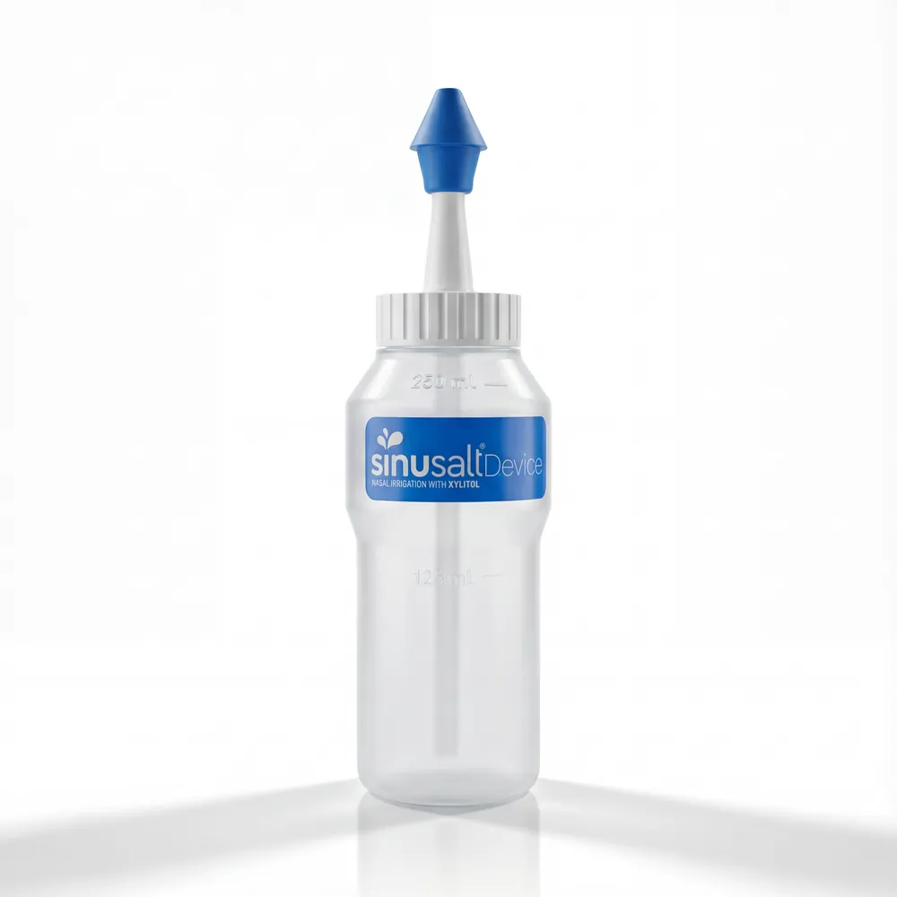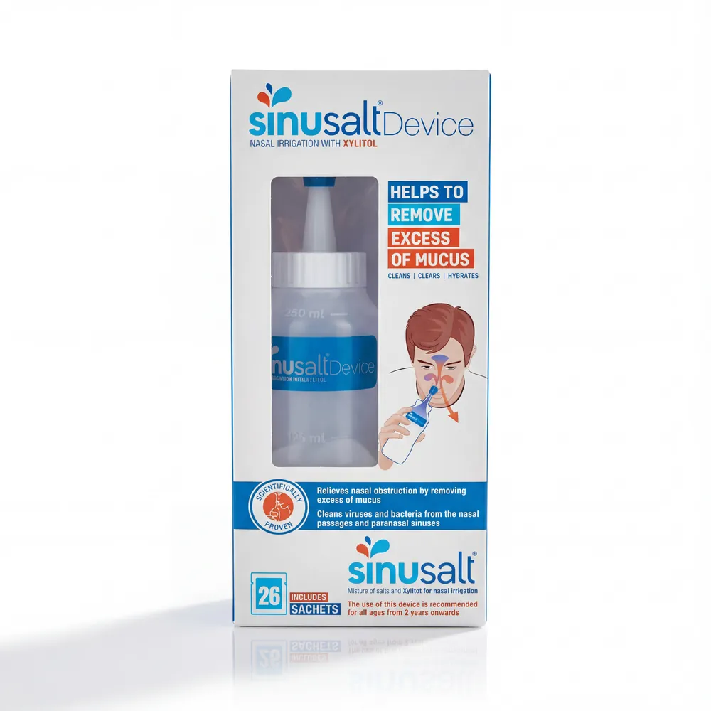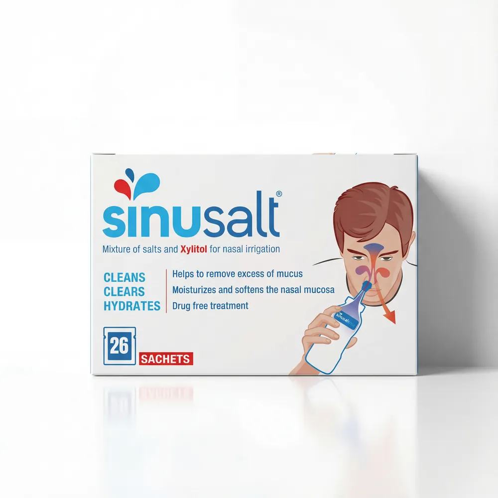 - СІНУСАЛТ містить суміш солей з ксилітом, спеціально розроблену для зрошення носа. Ксиліт є дуже гігроскопічним натуральним цукром, який пом’якшує зрошувальну рідину та покращує її очищаючий ефект, сприяючи видаленню бактерій і грибків;